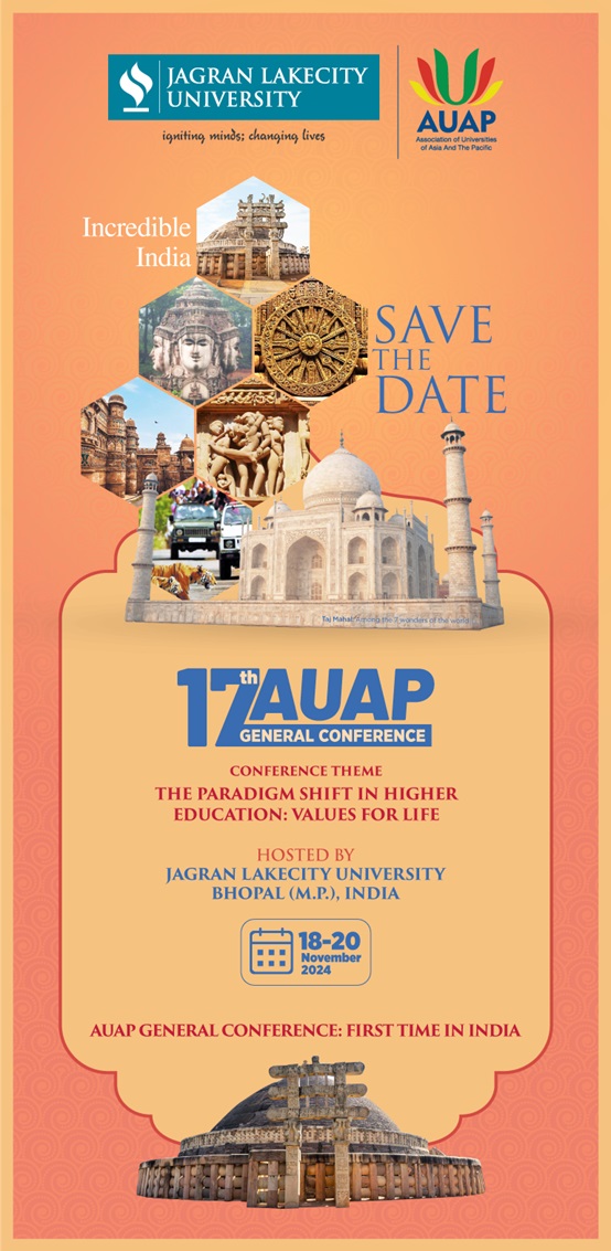The Association of Universities of Asia and the Pacific(AUAP) in cooperation with Jagran Lakecity University, Bhopal (Madhya Pradesh), India will organize the 17th AUAP General Conference on theme “The Paradigm Shift in Higher Education: Values for Life” on 18-20 November 2024 at Jagran Lakecity University, Bhopal (Madhya Pradesh), India.